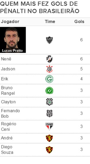 Os jogadores que mais fizeram gols de pênaltis na Série A foram Lucas Pratto, do Atlético-MG, e Nenê, do Vasco. Os dois cobraram seis penalidades no Brasileirão e converteram todas. Eles junto com Ricardo Oliveira, do Santos, são os jogadores que mais tiveram chances na marca fatal. No entanto, o artilheiro do Brasileirão desperdiçou quatro cobranças, recordista no quesito.