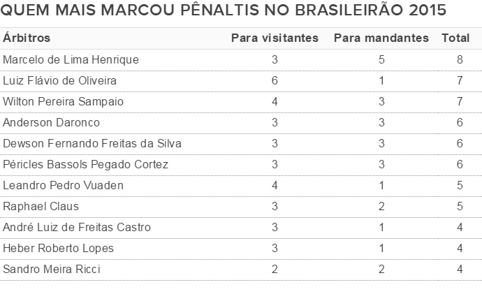 O árbitro que mais apontou para a marca da cal foi Marcelo de Lima Henrique. O juiz carioca assinalou oito pênaltis no Brasileirão, sendo três para o visitante e cinco para o mandante. Em segundo figuram Luiz Flávio de Oliveira, e Wilton Pereira Sampaio, ambos com sete marcações de penalidades. O paulista assinalou seis penais para os times que jogaram em território adversário e apenas um para os donos da casa, enquanto o goiano marcou quatro pênaltis para o visitante e três para o caseiro. Veja abaixo a lista dos árbitros que mais marcaram penais: