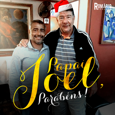 Descrição da Imagem #PraCegoVer: foto de Romário ao lado de Joel Santana. Sobre a imagem, está escrito "Papai Joel, parabéns!".
