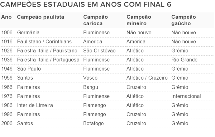 Torcedor de futebol e superstição costumam andar de mãos dadas, principalmente no Brasil. Tem aquele que não abre mão de vestir a mesma camisa, de cruzar o caminho de sempre até o estádio, e até aquele que repete até a cueca em partidas de seu clube. Para começar 2016, o blog Numerólogos separou a lista de campeões dos quatro principais campeonatos estaduais em anos com o final 6. Curiosamente, um clube por estado tem enorme destaque nas conquistas.