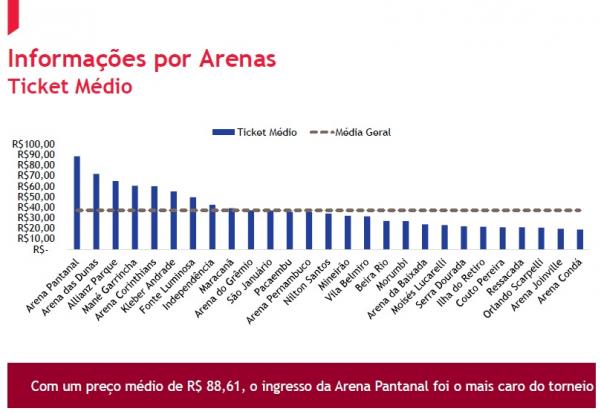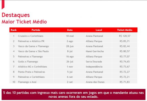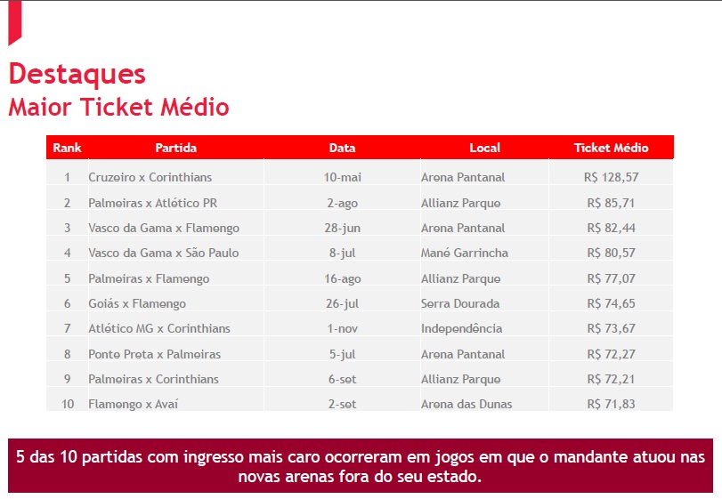 Dos 4 jogos do Brasileiro com ingressos médios mais caros, 2 tiveram o Vasco de mandante: Vasco x Flamengo, dia 28/06, na Arena Pantanal, em Cuiabá (R$ 82,44), e Vasco x São Paulo, no dia 08/07, no Mané Garrincha, em Brasília (R$ 80,57):