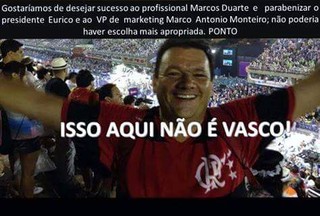 Em substituição a Bernardo Pontes, dispensado pelo departamento de marketing do Vasco no início de 2016, o clube acertou o retorno de mais um profissional que trabalhou com Eurico Miranda na sua primeira passagem pela presidência. O nome é de Marcus Duarte e já provocou alvoroço nas redes sociais. Torcedores do Vasco postaram fotos do novo gerente de marketing com camisa do Flamengo, em jogos com amigos e também em desfile de escola de samba.