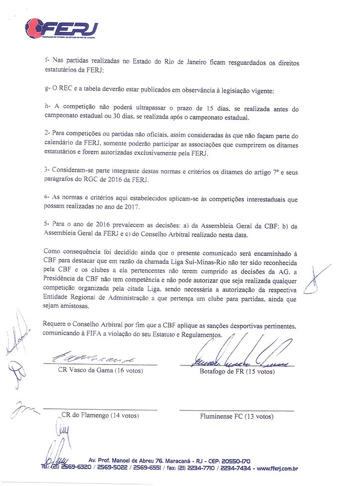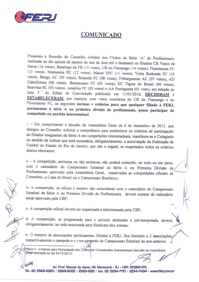 A Federação de Futebol do Rio (Ferj) divulgou nesta segunda-feira um comunicado oficial, assinado por todos os clubes que participam do arbitral da Primeira Divisão do Campeonato Carioca, à exceção de Flamengo e Fluminense. No documento, a entidade lista obrigações e critérios para participação de seus filiados. Deixa clara a posição de somente permitir a participação em 2017 e impõe critérios técnicos para classificação para a Primeira Liga (composta por clubes do RJ, RS, SC, PR e MG) - vagas ficariam com campeão e vice do estadual.