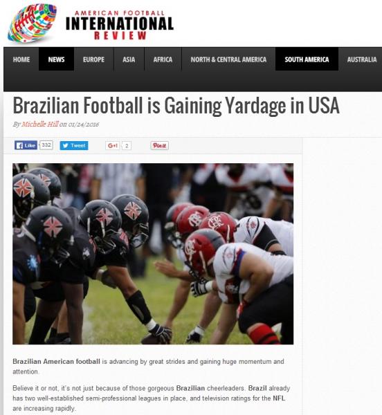 O site American International Football Review, um dos mais importantes do futebol americano fora da NFL, publicou nesta semana uma extensa matéria sobre o crescimento da modalidade no Brasil. E a foto que abre a reportagem mostra os times do Vasco e do Flamengo em campo, preparando-se para uma jogada.