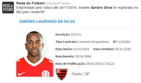Rede do Futebol @RededoFutebol Emprestado pelo Vasco até 30/11/2016, volante Sandro Silva foi registrado no BID pelo Oeste/SP: