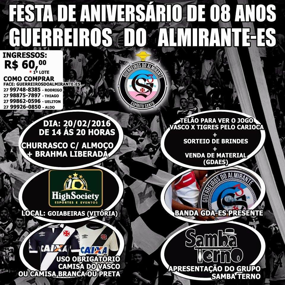 A GUERREIROS DO ALMIRANTE-ES CONVIDA TODOS OS VASCAÍNOS PARA COMEMORARMOS JUNTOS MAIS UM ANO DE LOUCURA.