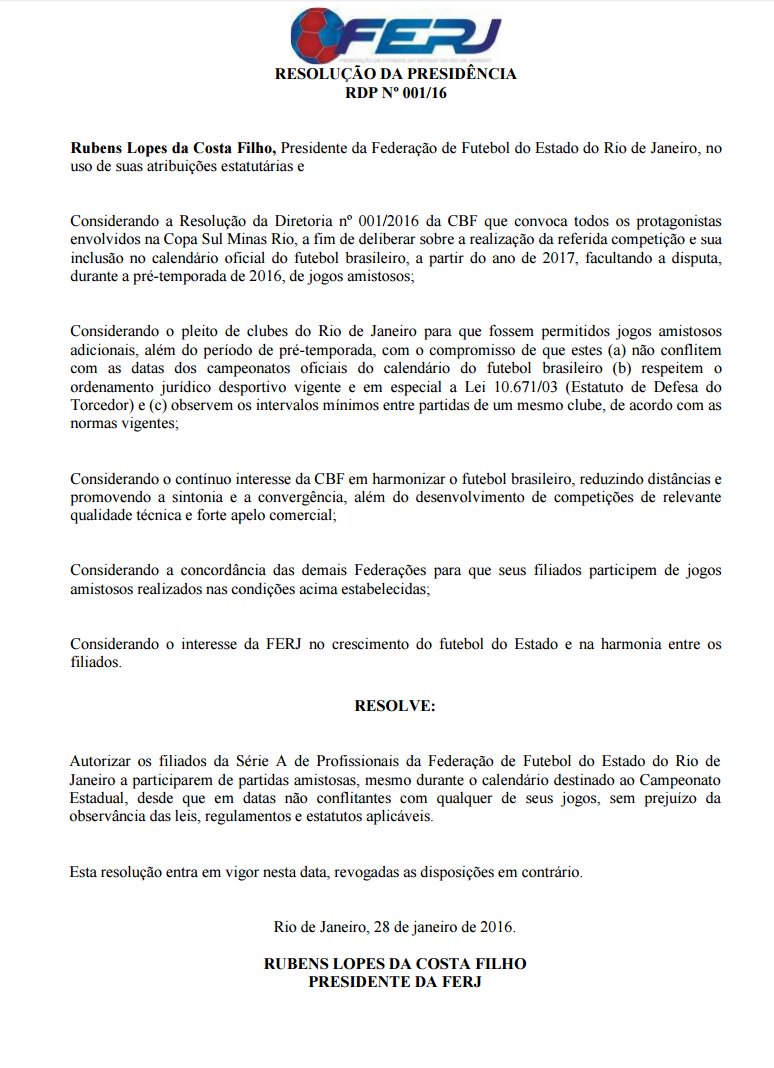 CONSIDERANDO a Resolução da Diretoria nº 001/2016 que convoca todos os protagonistas envolvidos na Copa Sul Minas Rio, a fim de deliberar sobre a realização da referida competição e sua inclusão no calendário oficial do futebol brasileiro, a partir do ano de 2017, facultando a disputa, durante a pré-temporada de 2016, de jogos amistosos;