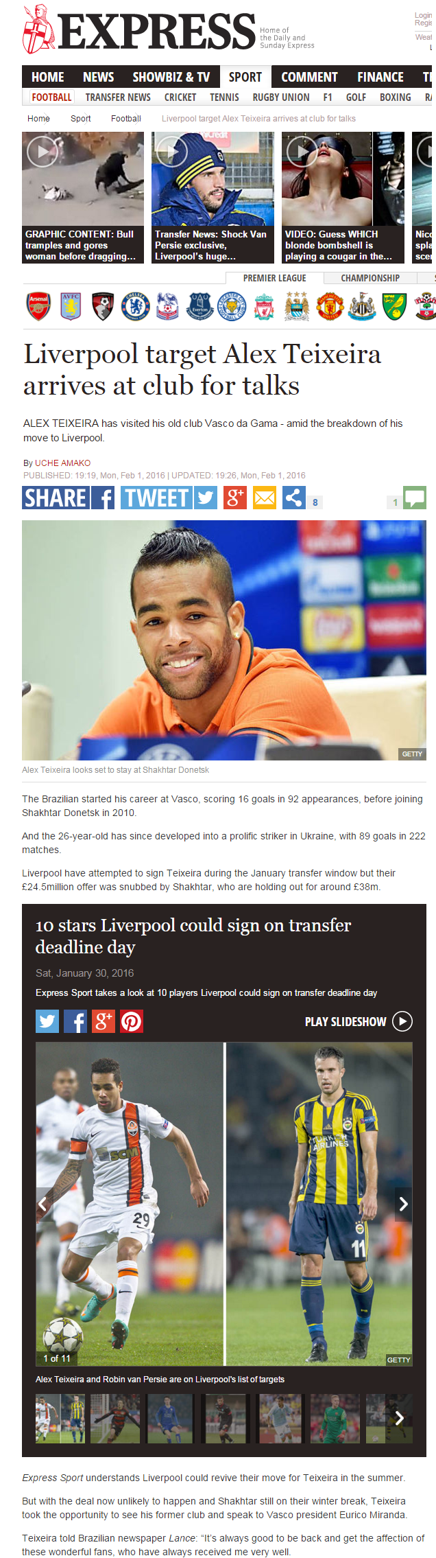 Visita de Alex Teixeira a São Januário repercute na imprensa inglesa