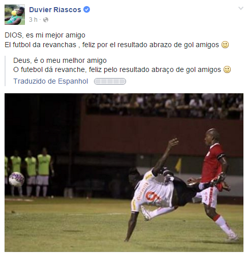 Riascos publica no Facebook foto de voleio e comenta: 'O futebol dá revanches'