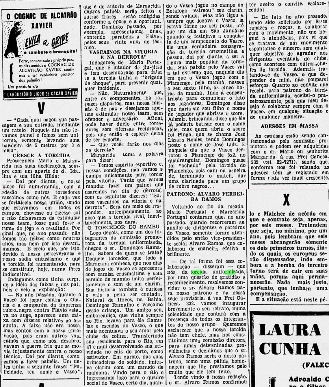 “Daí por diante, o nosso bloco foi aumentando, com a adesão de outros torcedores Vascaínos como nós. E cada vez se fortalecia nossa união, sendo que estávamos em todos os campos, chovesse ou fizesse sol e não deixávamos de estimular nosso team, fosse qual fosse o rumo do jogo e o resultado. Por sinal que, no ano passado não fomos tão felizes como noutros anos, mas nem por isso desanimamos. E creio que, por isto, devido a nossa perseverança e nosso sadio entusiasmo e que a Torcida, foi aumentando, para se constituir hoje, numa força indiscutível.