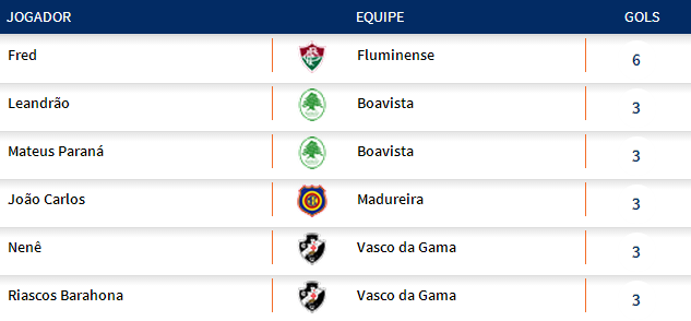 Com 3 gols marcados, Nenê e Riascos, ao lado de outros jogadores, estão em 2º lugar na artilharia do Estadual, que é liderada por Fred, do Fluminense, com 6 gols.