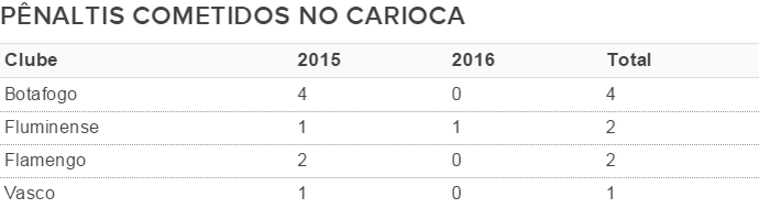 O Botafogo lidera o ranking de pênaltis cometidos nos dois últimos estaduais: quatro. A dupla Flamengo e Fluminense aparecem com duas marcações. O Tricolor, aliás, foi o único grande a ter um pênalti marcado contra neste estadual. Foi na desastrosa estreia contra o Volta Redonda, quando foi derrotado por 3 a 1.