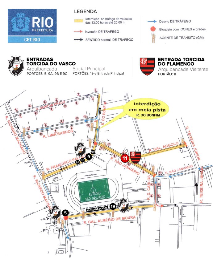 Assim, a torcida do Vasco terá de circular apenas pela Rua General Almério de Moura, onde ficam as entradas para a cadeira social e a do portão 5 (arquibancada), pela Ricardo Machado e pela Francisco Palheta, onde ficam as entradas para arquibancada (portões 9A, 9B e 9C).