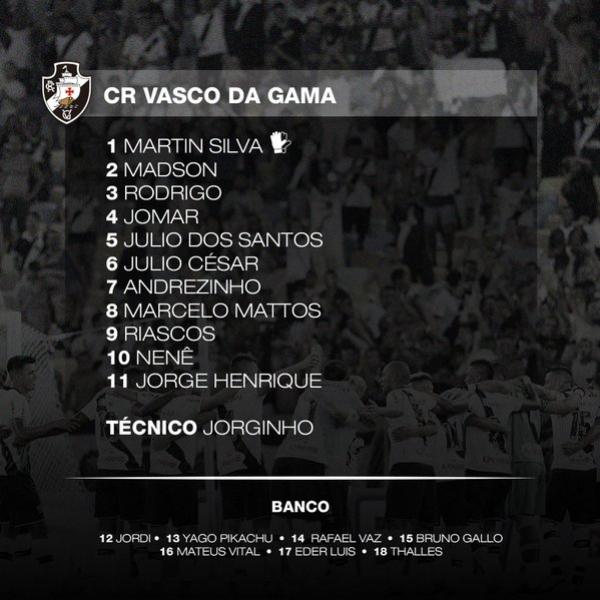 Escalação Vasco: Martin Silva, Madson, Jomar, Rodrigo, Júlio César; M. Mattos, Júlio dos Santos, Andrezinho, Nenê; Riascos e Jorge Henrique.