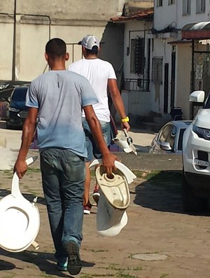 Entre gritos de “chiqueiro” e xingamentos contra Eurico Miranda, os mais exaltados quebraram vasos, portas dos banheiros e picharam as paredes. Neste momento, flamenguistas foram levados para o juizado no estádio de São Januário e ficaram até o fim da partida. Rubro-negros protestaram, e foi preciso a primeira tirada de gás de pimenta na área de visitantes. Após a primeira confusão, um funcionário do Vasco retirou três portas e pedaços dos vasos sanitários do lado rubro-negro – ainda havia um banheiro feminino. Mesmo quebrado, flamenguistas seguiram usando o banheiro, com policiais que ficaram na porta.