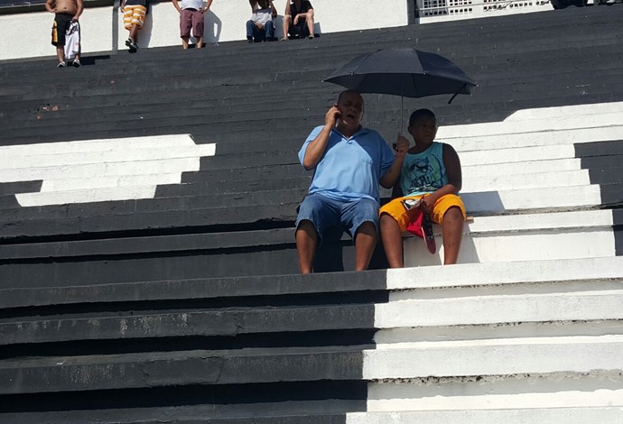 Alheios a tudo isso estavam Paulo Roberto, de 59 anos e Deyvid, de 11. Torcedores do Flamengo, estavam à paisana no setor destinado aos vascaínos, com uma sombrinha protegendo-os do sol, bem perto da divisão entre torcidas. Paulo aproveitou que tinha direito a gratuidade para trazer o vizinho de Quintino para assistir ao clássico. Tão logo o jogo começou, porém, viram que não era seguro ficar ali e procuraram outro lugar.