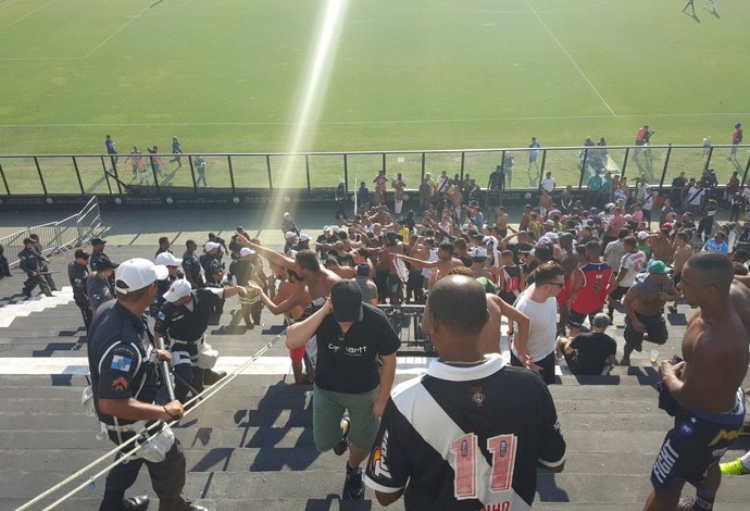 Antes do jogo, faltou água e sobrou gás de pimenta. O Grupamento Especial de Policiamento em Estádios e a segurança privada do Vasco tiveram muito trabalho para colocar ordem em São Januário. Pelo histórico de rivalidade e conflito em todo local onde se enfrentam, a preocupação era evidente em separar as torcidas. Até chegar ao estádio, a escolta funcionou, com mais de mil torcedores a pé da Praça Onze até São Januário – cinco quilômetros de caminhada sem registro de ocorrência. Com 17 detidos pela polícia, após depredação do banheiro de visitantes no estádio vascaíno, houve confusão antes e no intervalo da partida – com intervenção mais forte do policiamento que foi escalado no campo do Vasco.