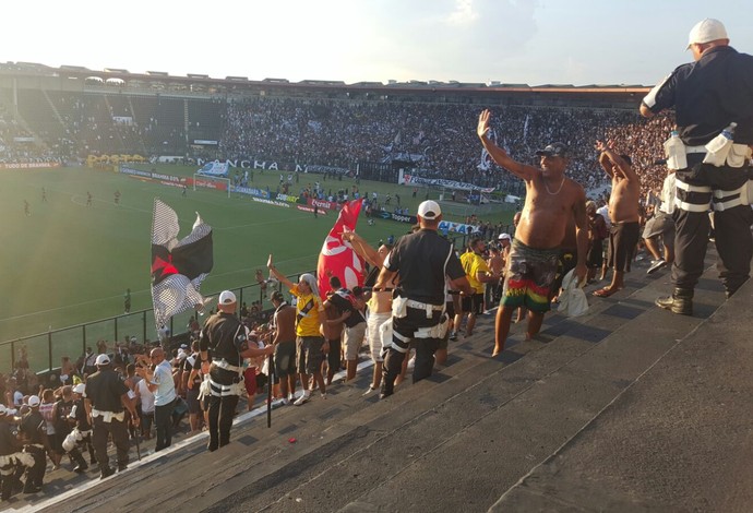 Os vascaínos tomaram conta dos acessos restantes. Espalharam-se pelos bares abertos, cantaram músicas provocativas e empunharam bandeirões. Alguns arriscaram-se até a trazer seus filhos para o jogo, confiando na segurança. De fato, até a entrada maciça dos torcedores, não houve episódios violentos no entorno. No máximo, um grupo de rubro-negros errou o caminho, passou pelo setor cruz-maltino e teve de ouvir impropérios enquanto era escoltado pela polícia até a entrada correta para seu setor.