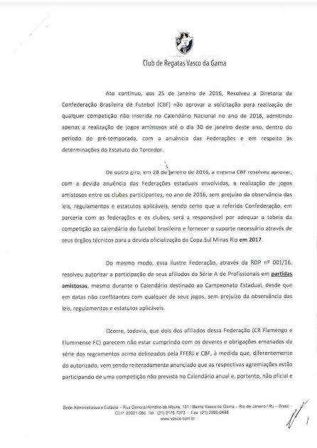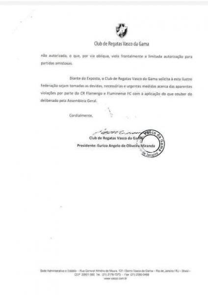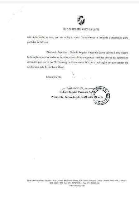 ![]() Ofício enviado pelo Vasco para Federação, pedindo punição aos rivais |