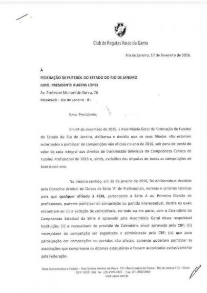 Em carta assinada pelo presidente Eurico Miranda, o Vasco lembra que em assembleia geral, no dia 4 de dezembro, ficou decidido que os afiliados da Ferj não estaria autorizados a participar de competições não oficiais. Entre as punições previstas, estavam a perda de cotas de TV do Estadual e exclusão de competições de base. Desde então, mais três encontros aconteceram e, no entendimento dos vascaínos, Flamengo e Fluminense estariam quebrando as regras estabelecidas com a presença na Primeira Liga. O texto cobra medidas "necessárias e urgentes acerca das aparentes violações". A Ferj não entende assim.