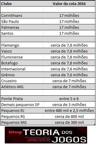 Percebam, em primeiro lugar, a discrepância de valores entre estaduais e o Brasileirão. Embora o nacional dure exatamente o dobro de um estadual (seis meses e vinte dias, contra três meses e dez dias do Carioca), a diferença paga chega, em alguns casos, a mais de dez vezes. Isto sem discrepância nas audiências – com leve tendência (acreditem) aos próprios estaduais: em 2015, dezesseis jogos do Paulista registraram média de 18,5 pontos para a Globo (quem paga a conta), enquanto 38 jogos dos clubes de São Paulo bateram 17,9 pontos no Campeonato Brasileiro.