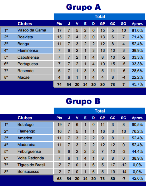 A 2 jogos do fim da 7ª e penúltima rodada da 1ª fase do Campeonato Estadual (Volta Redonda x Macaé, na 2ª-feira, 29/02, e Friburguense x Fluminense, na 4ª-feira, 02/03), o Vasco, que empatou com o Botafogo por 1 a 1, segue como líder isolado do Grupo A. O Gigante da Colina já está classificado por antecipação para a Taça Guanabara, assim como Boavista (Grupo A), Bangu (A), Botafogo (B) e Flamengo (B).