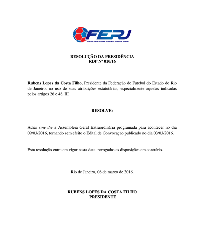 A Federação de Futebol do Rio (Ferj) cancelou a Assembleia Geral Extraordinária convocada para esta quarta-feira com objetivo de apreciar possível punição a Flamengo e Fluminense pela participação na Primeira Liga. A atitude é uma clara resposta ao presidente do Vasco, Eurico Miranda, que pediu publicamente a punição e, na segunda-feira, criticou a Ferj por não ter barrado as partidas da dupla nesta semana - foi dele o pedido de convocação da assembleia.