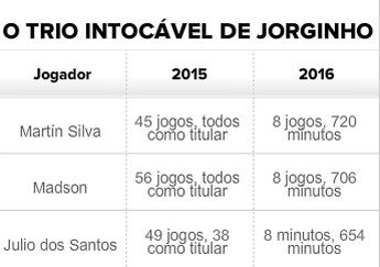 Regularidade é um dos lemas do Vasco nesta temporada. A manutenção da equipe da reta final do ano passado, tópico frisado na maioria dos discursos dos jogadores e comissão técnica, faz com que os titulares deem, com desenvoltura, continuidade ao trabalho feito. O time titular está bem delineado. No elenco, três atletas iniciaram todos os jogos do Cruz-Maltino no ano: o goleiro Martín Silva, o lateral-direito Madson e o volante Julio dos Santos. O trio já vem adquirindo confiança há algum tempo. Em 2015, antes de Jorginho chegar, eles ganharam oportunidades com frequência.
