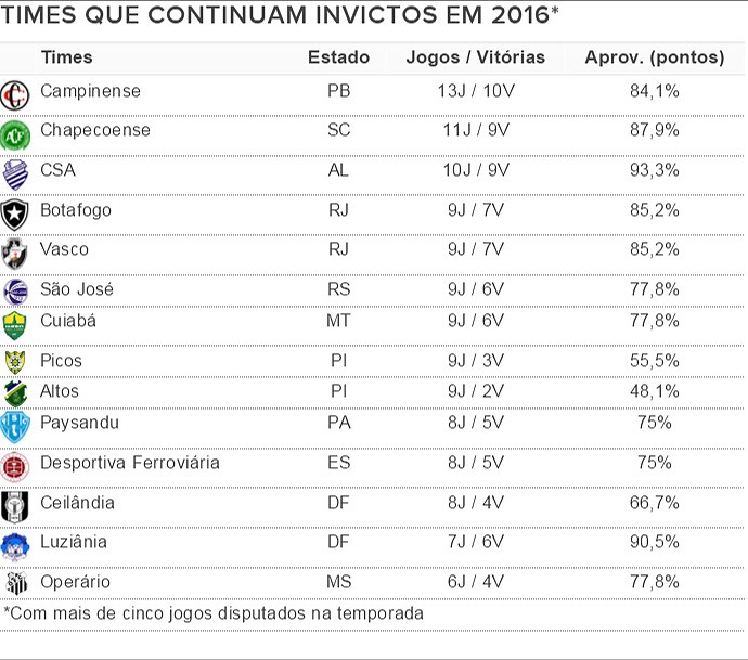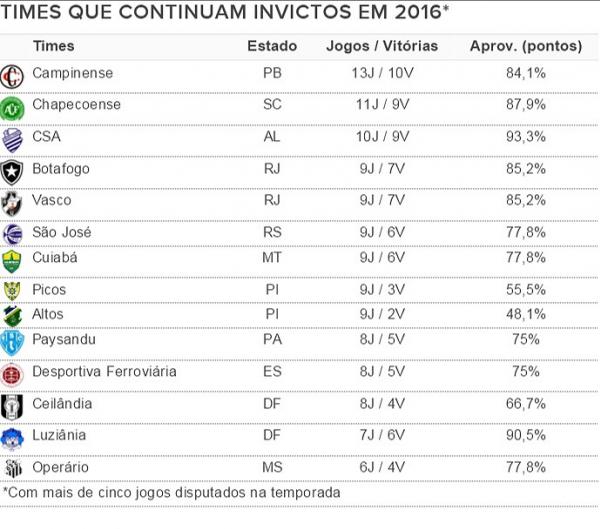 A temporada está apenas começando e, por isso, ainda é cedo para avaliações definitivas, mas poucos times das primeiras divisões estaduais ainda podem se orgulhar de não terem sido derrotados, dentre aqueles que fizeram mais de cinco jogos neste ano (leia abaixo sobre o critério). A lista dos 14 imbatíveis em 2016 chega à segunda quinzena de março com apenas dois times da Série A do Brasileirão, Botafogo e Chapecoense, e dois da Série B, Vasco e Paysandu. E o grande destaque é o Campinense, da Paraíba, que já entrou em campo 13 vezes e não saiu derrotado em nenhuma.