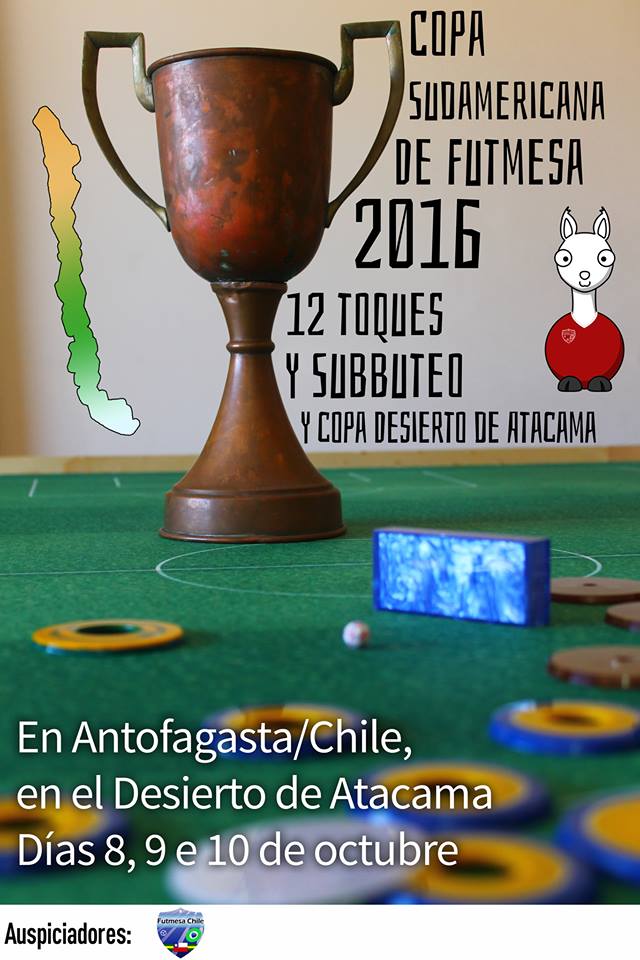 A Confederação Sulamericana de Futebol de Mesa confirmou a sede do VII Campeonato Sulamericano de Futebol de Mesa a ser realizado nos dias 8, 9 e 10 de Outubro em Antofagasta - Chile.