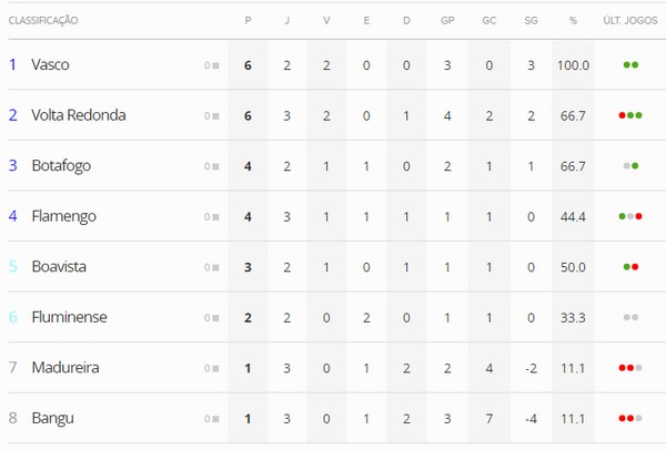 Veja como está a classificação da Taça Guanabara após os jogos deste sábado