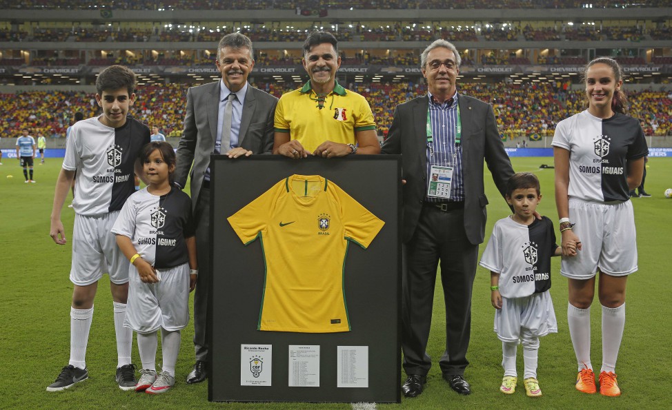 A homenagem definitiva pelo tetra veio na nesta quinta-feira (25), antes da partida Brasil x Uruguai. Ricardo Rocha recebeu do presidente da Federação Pernambucana de Futebol Evandro Carvalho e do coordenador de Seleções Gilmar Rinaldi a sua camisa amarela emoldurada em um grande quadro e teve seu nome gritado em coro pelos torcedores que lotaram a Arena Pernambuco.