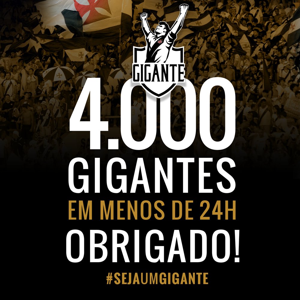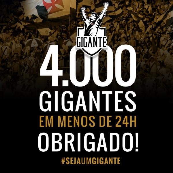 Em apenas 24h, o programa Sócio Torcedor Gigante atingiu o número de 4 mil adesões. Como ocorreu em diversos momentos de nossa história, esta marca demonstra mais uma vez a importância e a força da torcida vascaína.