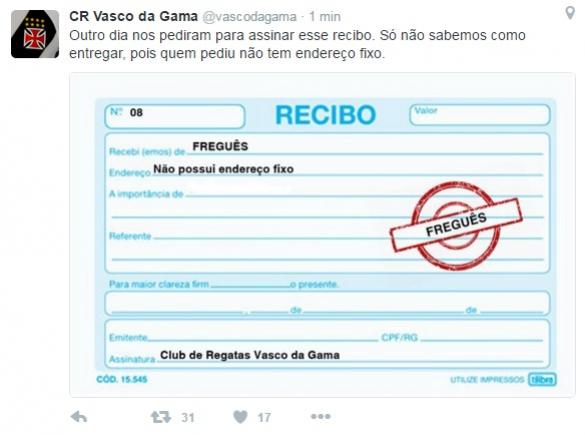 CR Vasco da Gama @vascodagama Outro dia nos pediram para assinar esse recibo. Só não sabemos como entregar, pois quem pediu não tem endereço fixo.