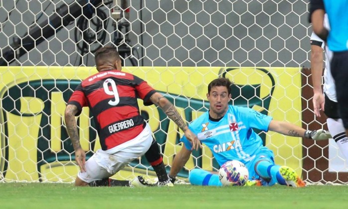 Após pegar um jatinho fretado para sair do Uruguai e participar do clássico entre Flamengo e Vasco, o goleiro cruz-maltino comprovou em campo que valeu o esforço. Após um cruzamento na área, Guerrero, sozinho, chutou a queima-roupa e o arqueiro salvou. O atacante também pegou o rebote, mas bateu fraco, para outra grande defesa.