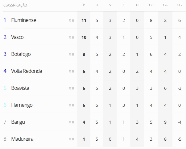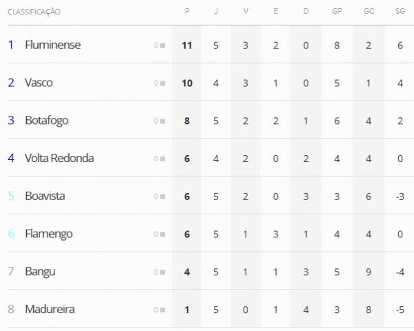 O Fluminense venceu o Madureira por 3 a 1 na noite deste sábado (02/04), chegou aos 11 pontos e assumiu a liderança da Taça Guanabara. No entanto, a equipe tricolor pode ficar no 1º lugar apenas por um dia. Atualmente com 10 pontos, o Vasco jogará contra o Volta Redonda neste domingo (03/04) e poderá retomar a posição em caso de vitória. A partida é a única que resta da 5ª rodada da Taça Guanabara.