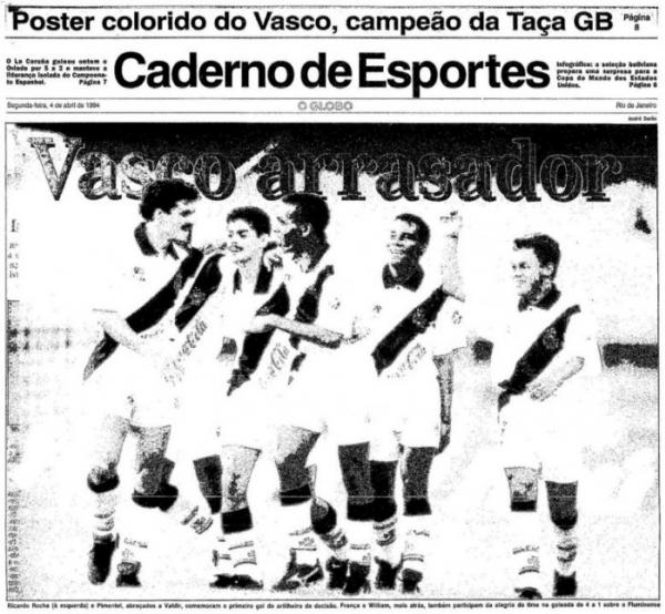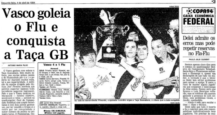 No dia 03 de abril de 1994, há 22 anos, o Vasco conquistava sua 8ª Taça Guanabara impondo uma goleada de 4×1 sobre o freguês das Laranjeiras. Os gols foram de Valdir (2), Yan e Pimentel.