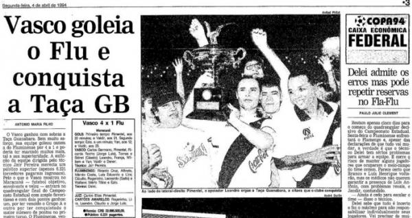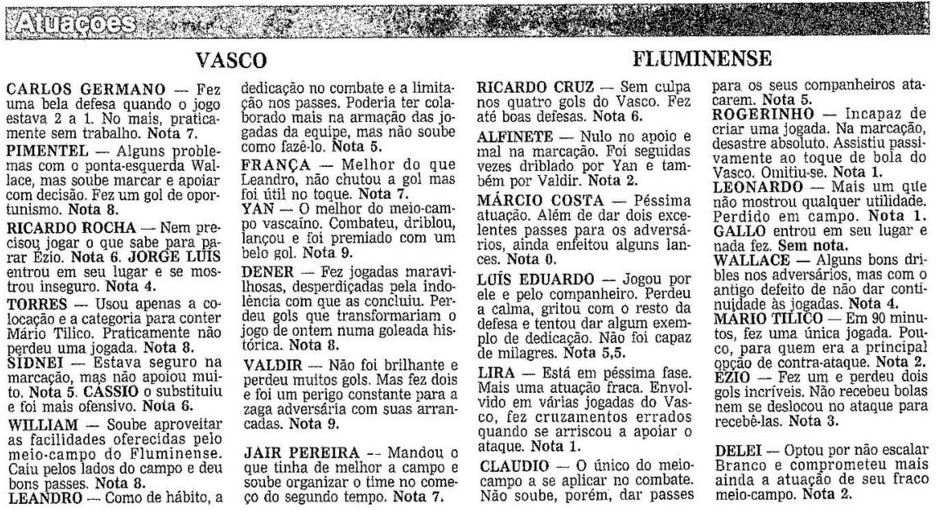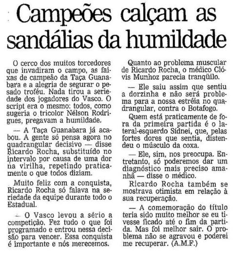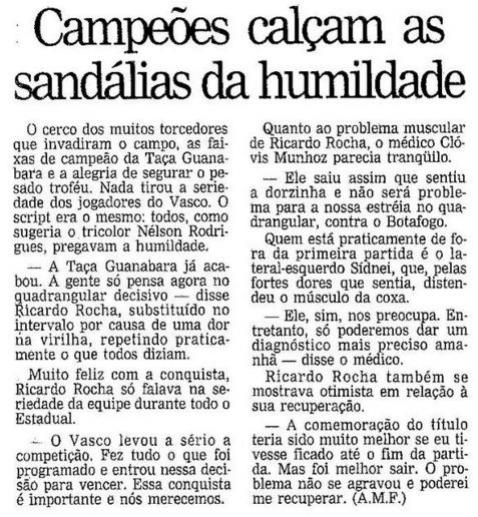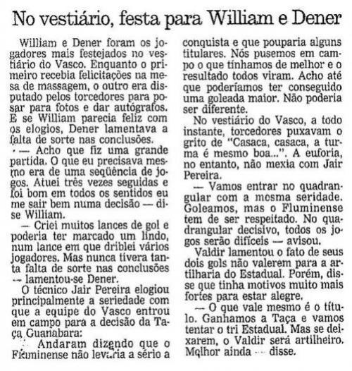 O Vasco ganhou com sobras a Taça Guanabara. Sem muito esforço, sua equipe goleou ontem a do Fluminense por 4 a 1 e poderia ter marcado muitos mais, tal a sua superioridade (…) Pelo o que o Vasco mostrou no Maracanã — futebol objetivo, envolvente e veloz — entrará no quadrangular final do Campeonato Estadual com amplo favoritismo.”