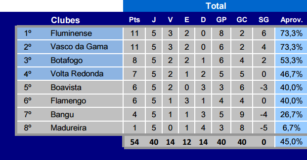 Terminada a 5ª rodada da Taça Guanabara, o Vasco, que empatou com o Volta Redonda por 1 a 1, caiu do 1º para o 2º lugar na classificação. O Gigante da Colina está agora empatado em pontos (11) com o Fluminense, mas atrás do rival pelo critério do saldo de gols (+6 contra +4).
