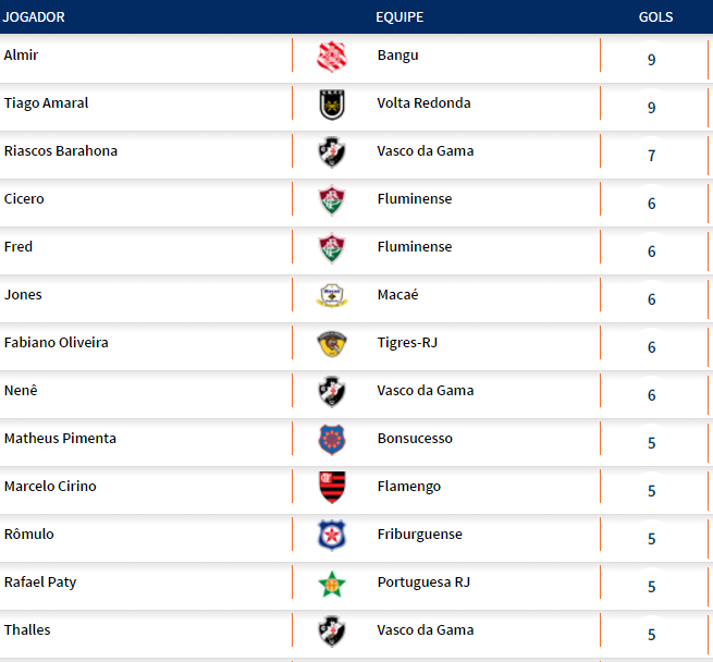 Com 7 gols, Riascos segue isolado na 3ª colocação na artilharia; os líderes são Tiago Amaral, do Volta Redonda, e Almir, do Bangu, ambos com 9 gols.