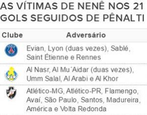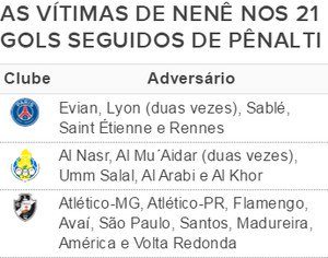 Cahê Mota @cahemota Foram 21 gols de pênaltis seguidos desde 14/12/2011. Confira quais foram as vítimas de Nenê no período #gevas