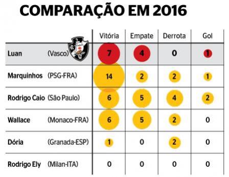 Rodrigo Ely, por exemplo, não tem nenhuma partida pelo Milan este ano. Dória, ex-Botafogo e São Paulo, entrou em campo apenas três vezes pelo Granada em 2016. Enquanto isso, Luan já disputou 11 jogos pelo Vasco, com sete vitórias e quatro empates. Salvo algum problema de lesão, até a convocação, apenas Rodrigo Caio, pelo São Paulo, estará na ativa como Luan.