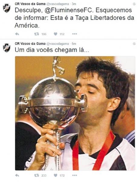 O Vasco, por sua vez, publicou uma foto de Mauro Galvão beijando a taça da Libertadores, conquistada pelo clube em 1998, com a mensagem de que "um dia vocês chegam lá" e "introduziu" o caneco aos tricolores, que ainda não levaram o título para as Laranjeiras.
