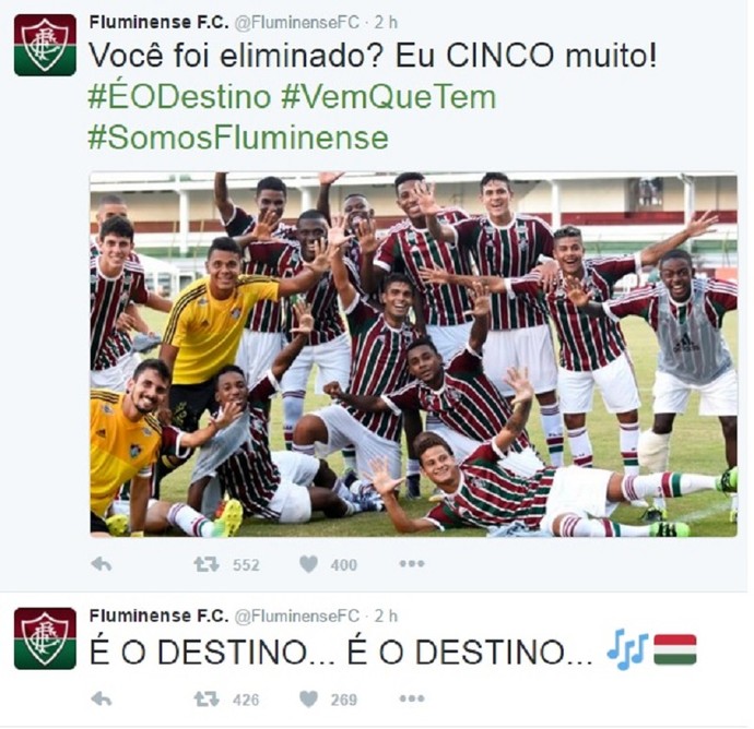 A rivalidade entre Fluminense e Vasco chegou ao Sub-20. Em partida válida pela semifinal da Taça Guanabara, o Tricolor aplicou, em casa, uma goleada de 5 a 0 no Cruzmaltino, garantiu vaga na final e de quebra ainda tirou sarro do rival. Em sua conta oficial no Twitter, o Flu publicou "é o destino", e ainda fez um trocadilho com o resultado do jogo: "Eu CINCO muito".