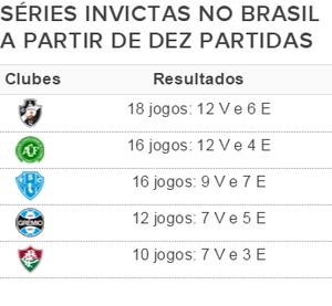 O último revés do time de Jorginho aconteceu no dia 1º de novembro, por 1 a 0, diante do Fluminense, no Engenhão, pela 33ª rodada do Campeonato Brasileiro. Desde então, são 12 vitórias e seis empates (sendo três triunfos e duas igualdades ainda na disputa nacional). Quem mais se aproxima dos vascaínos é a dupla Chapecoense e Paysandu, imbatível há 16 partidas. Os catarinenses acumulam 12 vitórias e quatro empates, enquanto o time do Pará, que também disputa a Série B, tem mais tropeços no cartel: nove vitórias e sete empates.