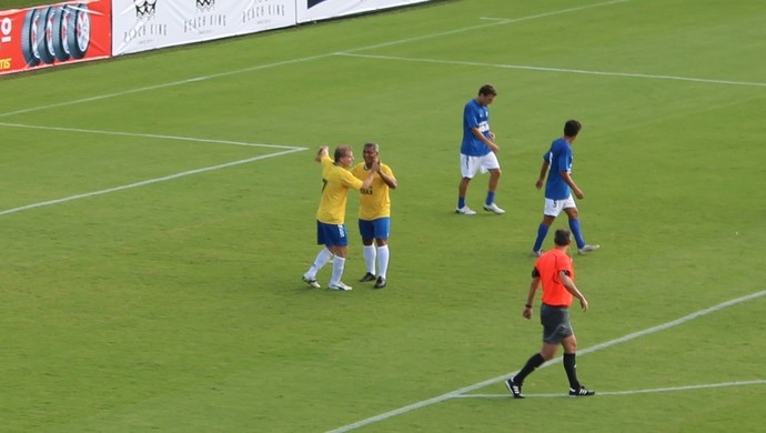 Romário formou dupla de ataque com Túlio Maravilha, e não faltaram gols. Os dois ex-atacantes, que alcançaram a marca de mil gols na carreira cada, balançaram as redes neste sábado – Romário fez três, e Túlio, dois. O outro gol da equipe do “Baixinho”, que venceu por 6 a 4, foi marcado por Iranildo, ex-meia do Flamengo e do Brasiliense. Para o time de Alex Dias, que jogou de azul, o ex-volante do Palmeiras e da seleção brasileira Flávio Conceição, Carlos Alberto, Wilson Goiano, além do próprio Alex Dias descontaram.