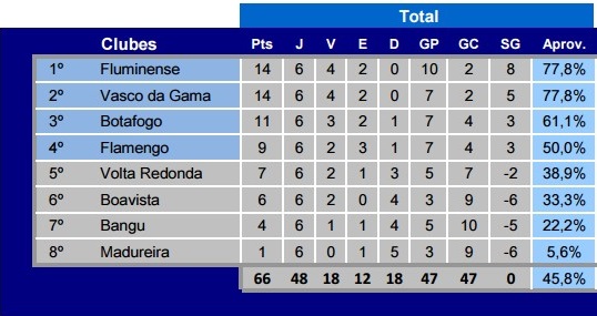 Vasco 3º colocado na Taça Guanabara; Botafogo 2º colocado; Fluminense campeão