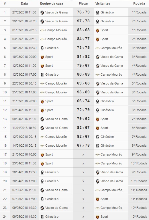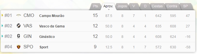Após 8 de 12 rodadas da fase regular da Liga Ouro, o Vasco está em 2º lugar na classificação. O 1º colocado avança direto para a decisão, enquanto o 2º e o 3º colocados farão um play-off pela outra vaga. O campeão disputará o NBB em 2017.