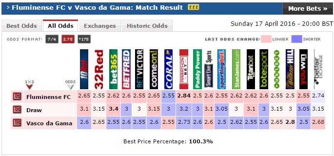 Uma aposta na vitória do Vasco paga, para cada R$ 1,00 apostado, entre R$ 2,50 e R$ 2,80; na vitória do Fluminense, entre R$ 2,50 e R$ 2,84; e no empate, entre R$ 3,00 e R$ 3,40. Quanto menor a cotação, maior a probabilidade de um resultado acontecer.