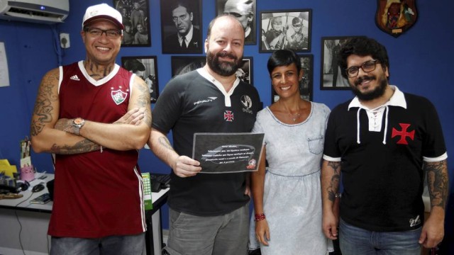 ![]() Da esquerda para direita: Jefferson Souza, tatuador tricolor, Marco Anubis, tatuador vascaíno, Juliana Sposito, torcedora do Fluminense, e Celso Rodrigues, vascaíno |